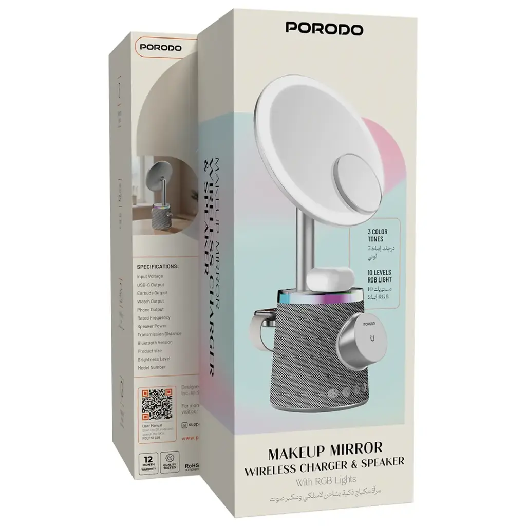 The Porodo Makeup Mirror Wireless Charger & Speaker with RGB Lights is a 3-in-1 device that unifies beauty, ease, and style. It integrates the RGB lights with 3 different colors and 10 different brightness levels, making it the best for daily makeup or grooming. In addition to this, the device consists of a 15W wireless charger for phones, a 5W charger for earbuds, and a 3W charger for watches. Thus, your most important gadgets will always be charged when you get ready. A 5W Bluetooth speaker is built into the device, allowing you to listen to your favorite music and thus providing an exhilarating experience. It is designed in such a way that multi-device compatibility is maintained, hence it blends into the routine smoothly, thereby making it a perfect pick for any vanity or desk in the office. Ergonomically designed, it leads to user-friendliness, while Bluetooth 5.1 ensures uninterrupted connectivity for wireless use.
