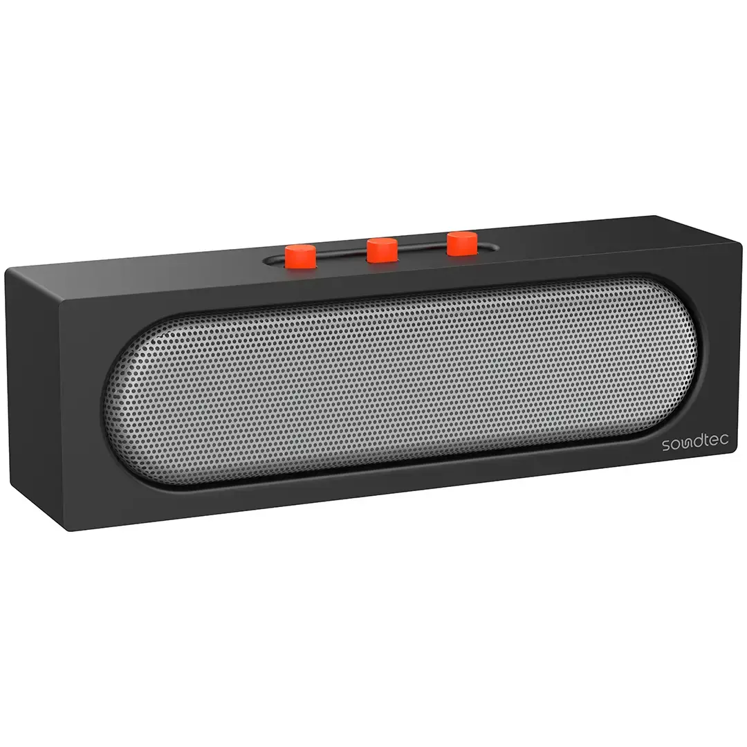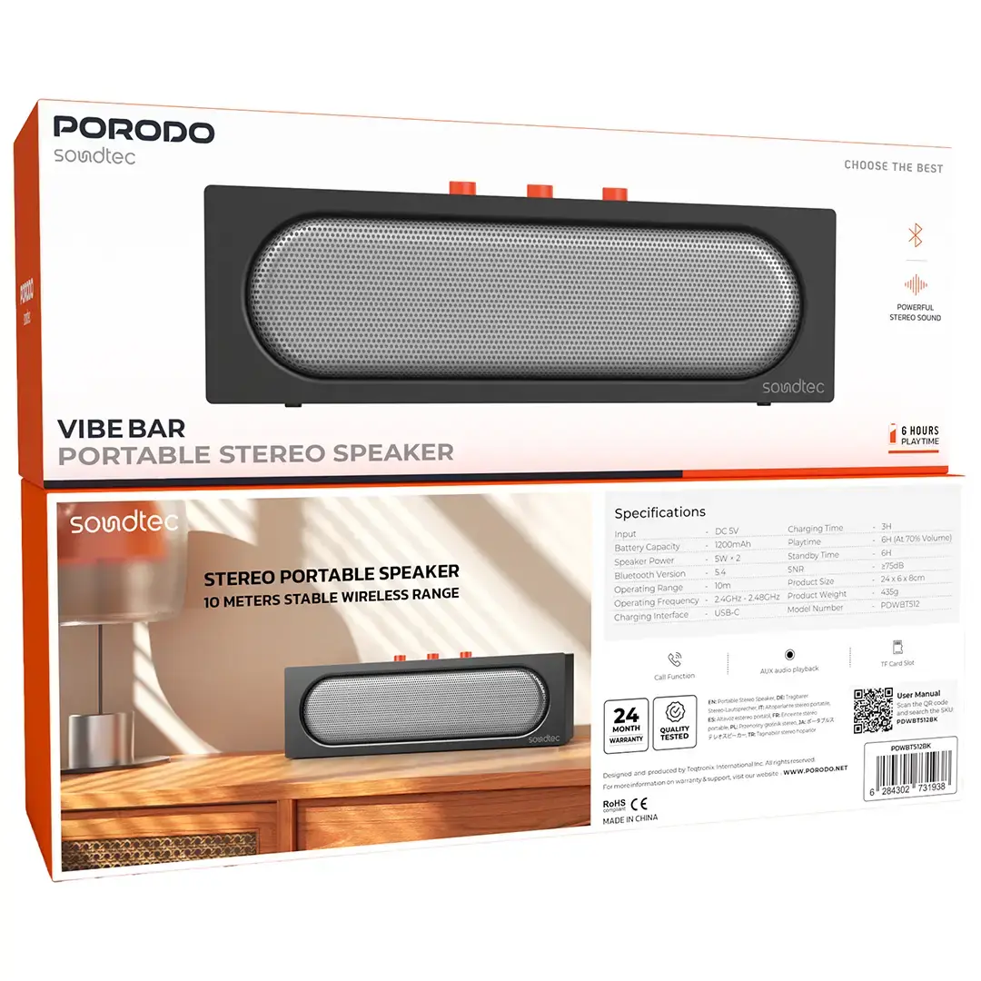 The Porodo Soundtec Vibe Bar Portable Stereo Speaker – Black is for the power sound lovers who are always on the go. Its playing time of 6 hours at 70% volume makes it just right for long trips, beach days, or backyard barbecues. The Bluetooth V5.4 speaker gives a wireless range of 10 meters and keeps the music playing without interruptions due to its stable connectivity. The FM radio playback can get you to your favorite radio stations, and the TF card slot is another way to listen to your music. The speaker is user-friendly with its single control button for all functions. The battery is 1200mAh with USB-C charging; it takes only a short time to recharge and is well able to provide power for the entire day. The speaker is designed for portability; it can be squeezed into any travel bag, and that is why it will be your perfect music mate, no matter where you go.